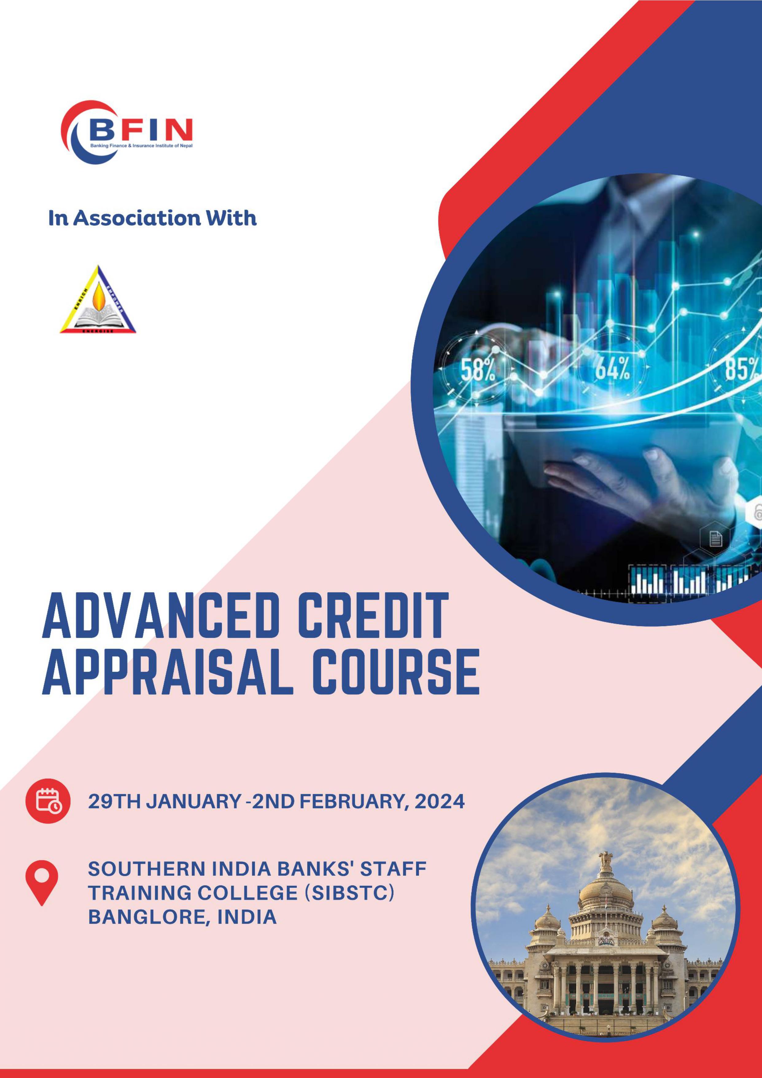 We are pleased to inform you that Banking Finance and Insurance Institute of Nepal Limited (BFIN) is organizing a five days training on “Advanced Credit Appraisal Course’’ in collaboration with Southern India Banks’ Staff Training College (SIBSTC) scheduled on 29 January – 02 February 2024 at SIBSTC, Bangalore, India .
