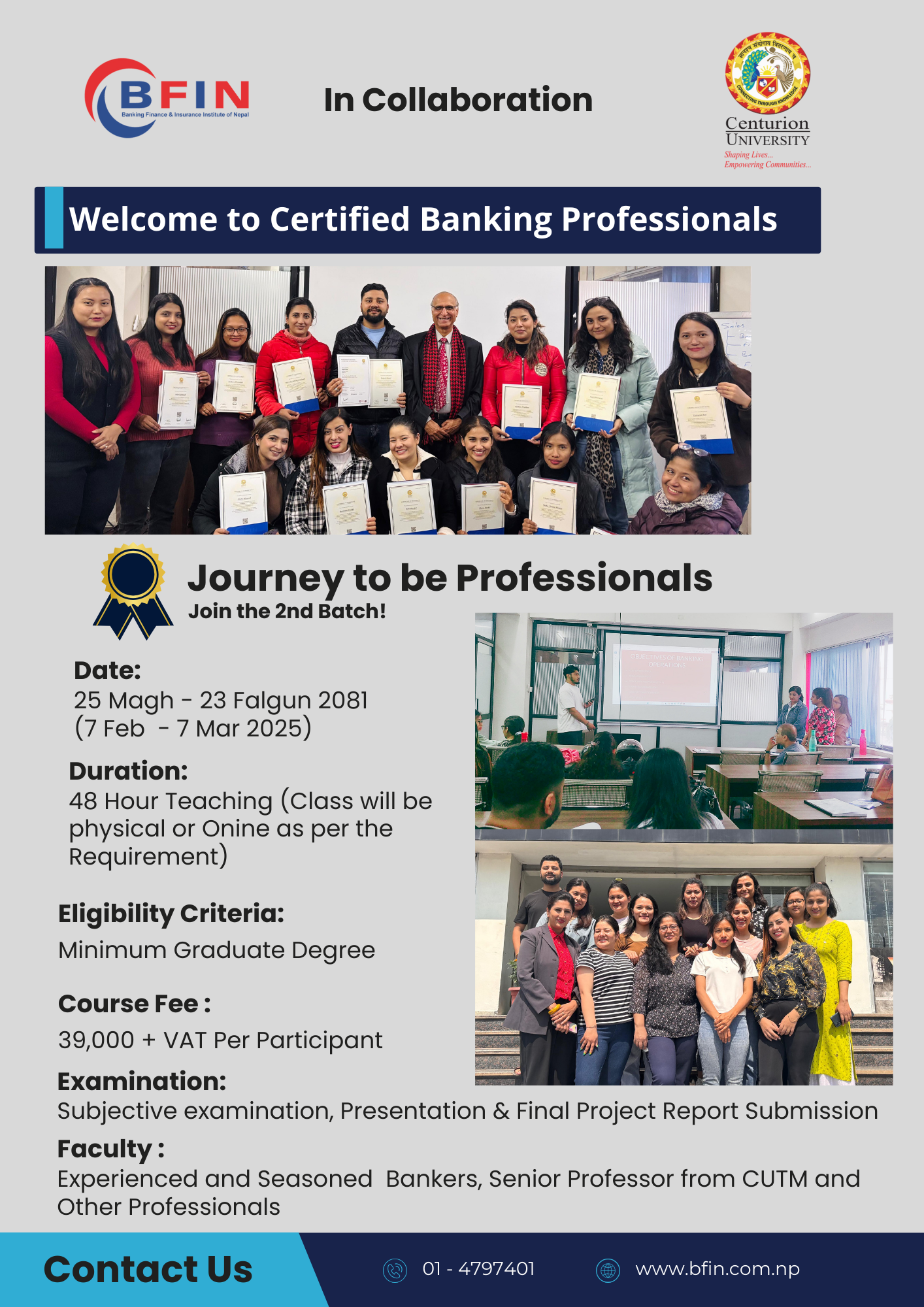 We are pleased to inform you that Banking Finance and Insurance Institute of Nepal (BFIN) in collaboration with Centurion University of Technology and Management (CUTM), India is organizing a certification course titled “Certified Banking Professional (CBP)” on dated 23 Falgun – 23 Chaitra 2081 | 7th March – 5th April 2025 at BFIN Hall, Krishna Tower, and New Baneshwor.