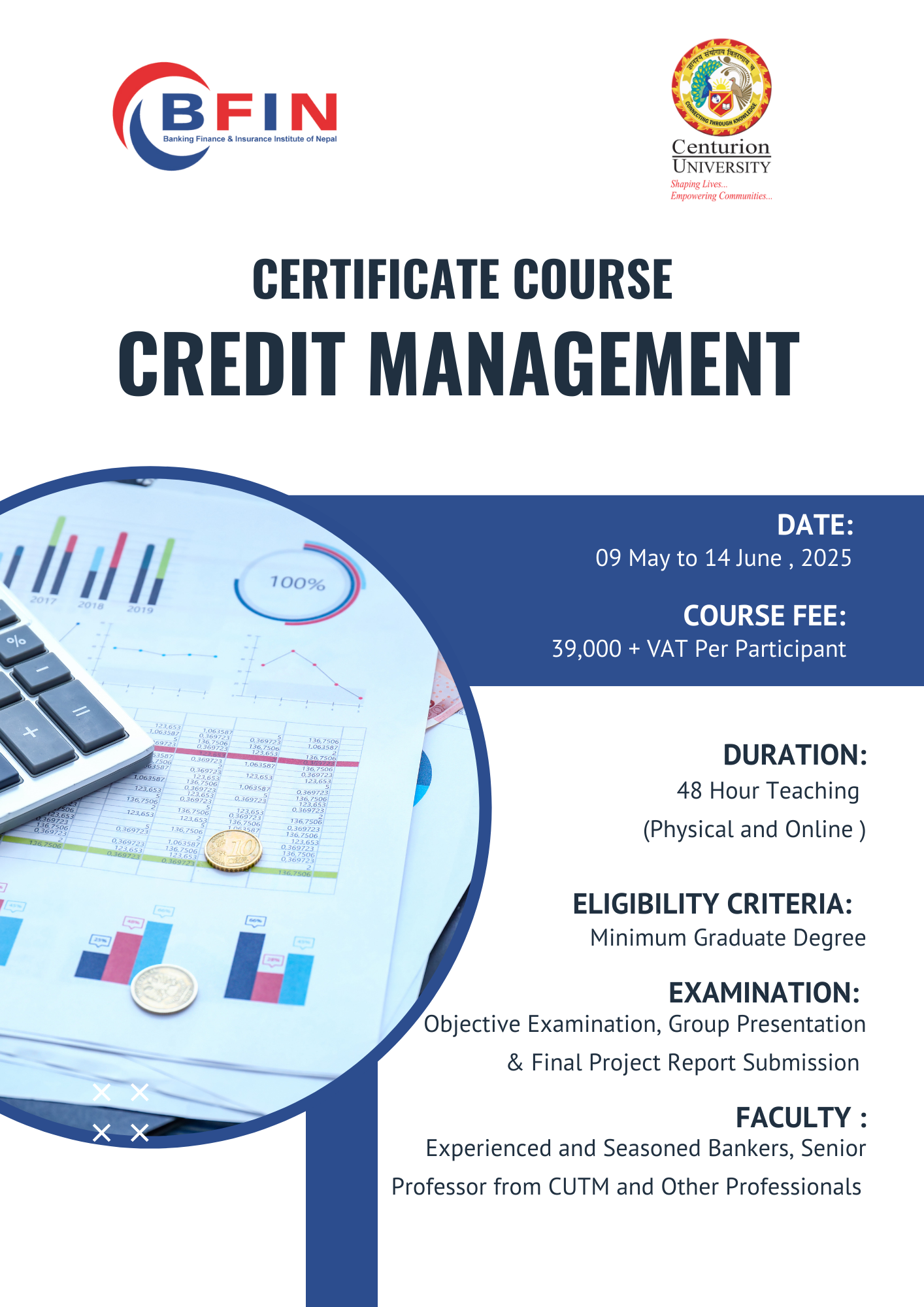 We are pleased to inform you that Banking Finance and Insurance Institute of Nepal (BFIN) in collaboration with Centurion University of Technology and Management (CUTM), India is organizing a certification course titled “Certified Credit Management” dated on 09 May to 14 June, 2025 at BFIN Hall, Krishna Tower, New Baneshwor.