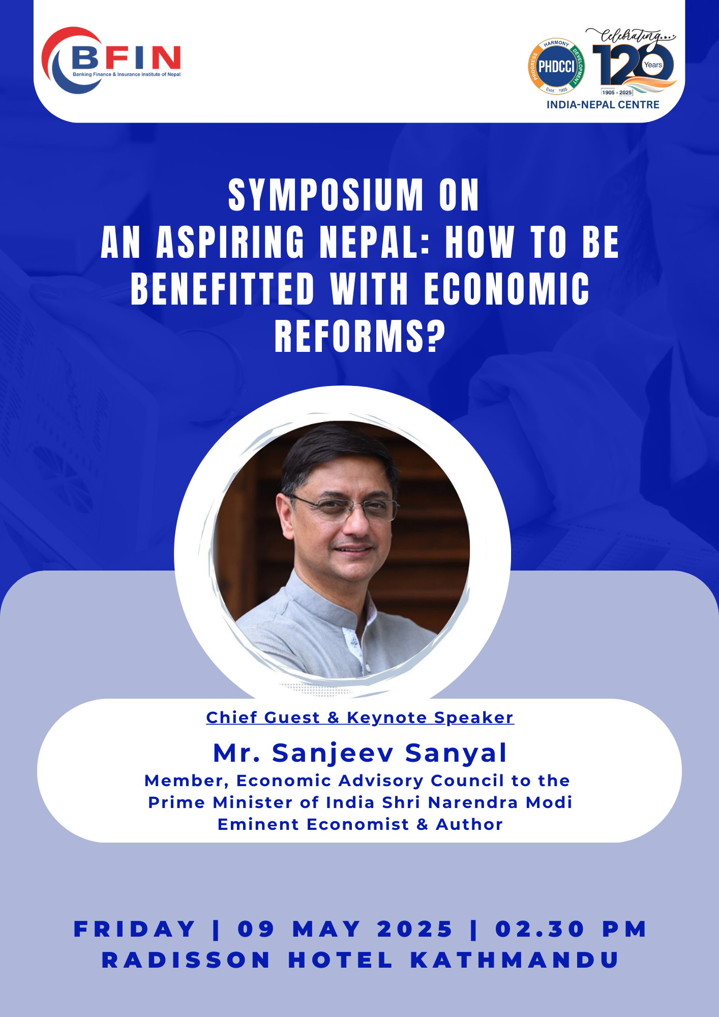 The Banking, Finance, and Insurance Institute of Nepal (BFIN), in collaboration with PHDCCI India-Nepal Centre, is pleased to present the Symposium on the theme “An Aspiring Nepal: How to be Benefitted with Economic Reforms?” scheduled to take place on May 9th, 2025 at Hotel Raddison, Kathmandu, Nepal. It will feature distinguished experts, including Mr. Sanjeev Sanyal, an eminent economist and a member of the Economic Advisory Council to the Prime Minister of India, along with policymakers, business leaders, and academicians from both countries.
